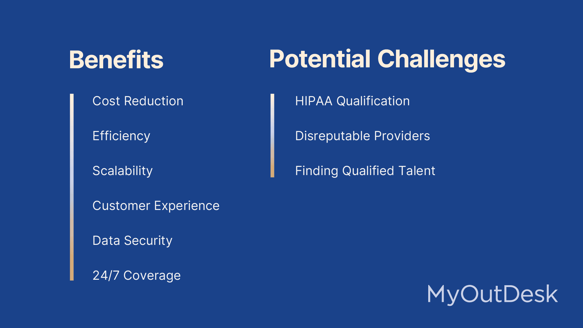 A company needs to find a reputable vendor with the quality of talent that meets its needs. For example, medical offices must ensure that outsourced talent is Health Insurance Portability and Accountability Act (HIPAA)-compliant to ensure security and compliance with federal regulations.