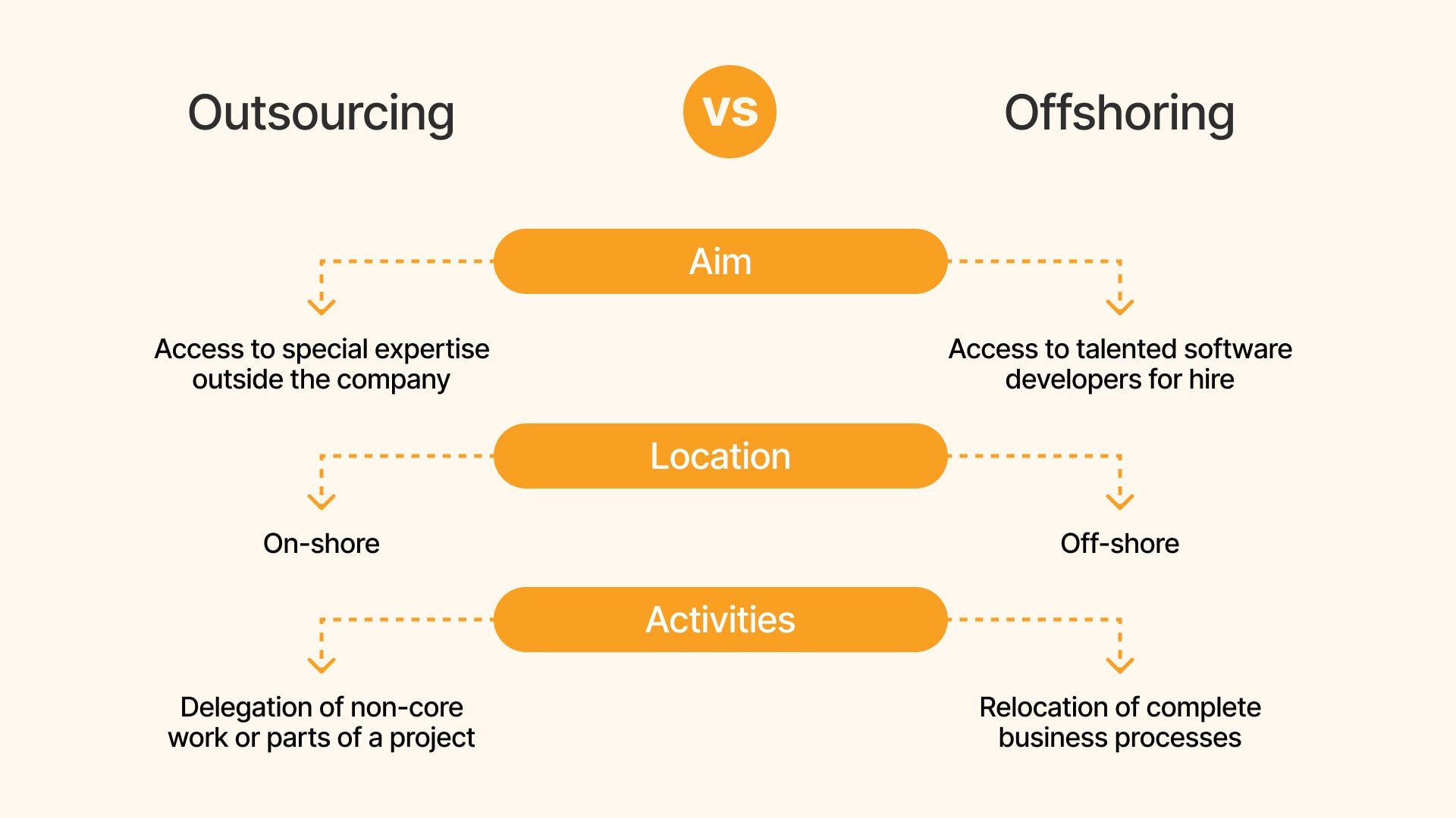 | Location | The vendor providing the outsourced services can be located anywhere, including within the same country or internationally. | By definition, offshoring involves moving operations to another country, often developing nations with lower costs. |